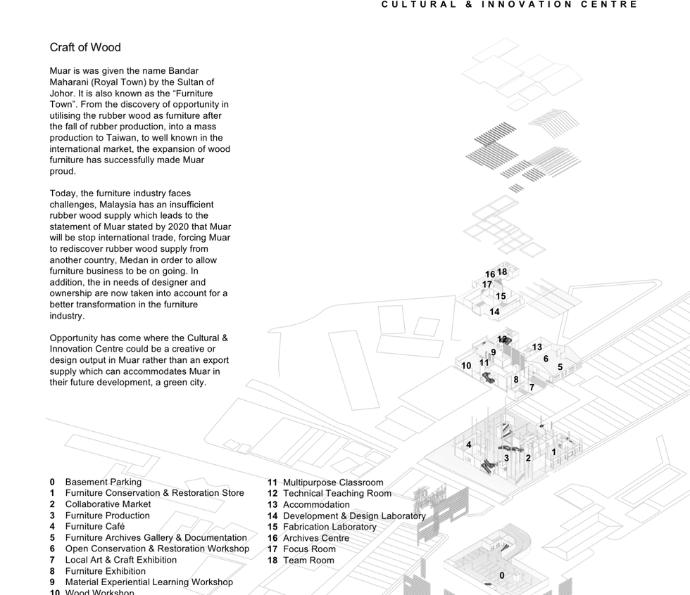 This project calls for a design of a Cultural and Innovative Centre for the city of Muar, Johor in which the centre transforms into a cultural landmark and public activity centre for the city. With Muar’s recent recognition as the Furniture Capital of Malaysia 2018 and the Cleanest Tourist City in ASEAN Region, the local government believes the city of Muar has great potential with more culture to offer and promote. Thus, the project will establish a new place and node to showcase the culture, tradition, and creative work of the people of Muar.